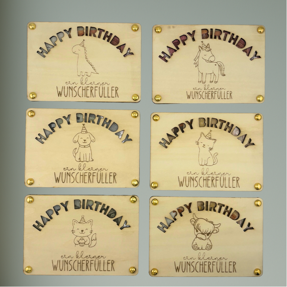 Unsere Geschenk-Karten für Kindergeburtstag bringen Kinderaugen garantiert zum Strahlen. Wähle aus 6 fröhlichen Tiermotiven – Einhorn, Dino, Fuchs, Highland-Kuh, Hund oder Katze – und mach die Karte zu etwas ganz Besonderem.