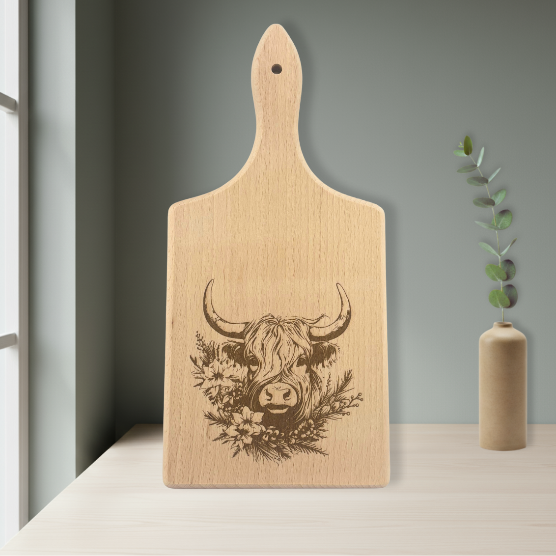 Schneidebrett mit Griff aus Buche – funktional, stilvoll & gelasert