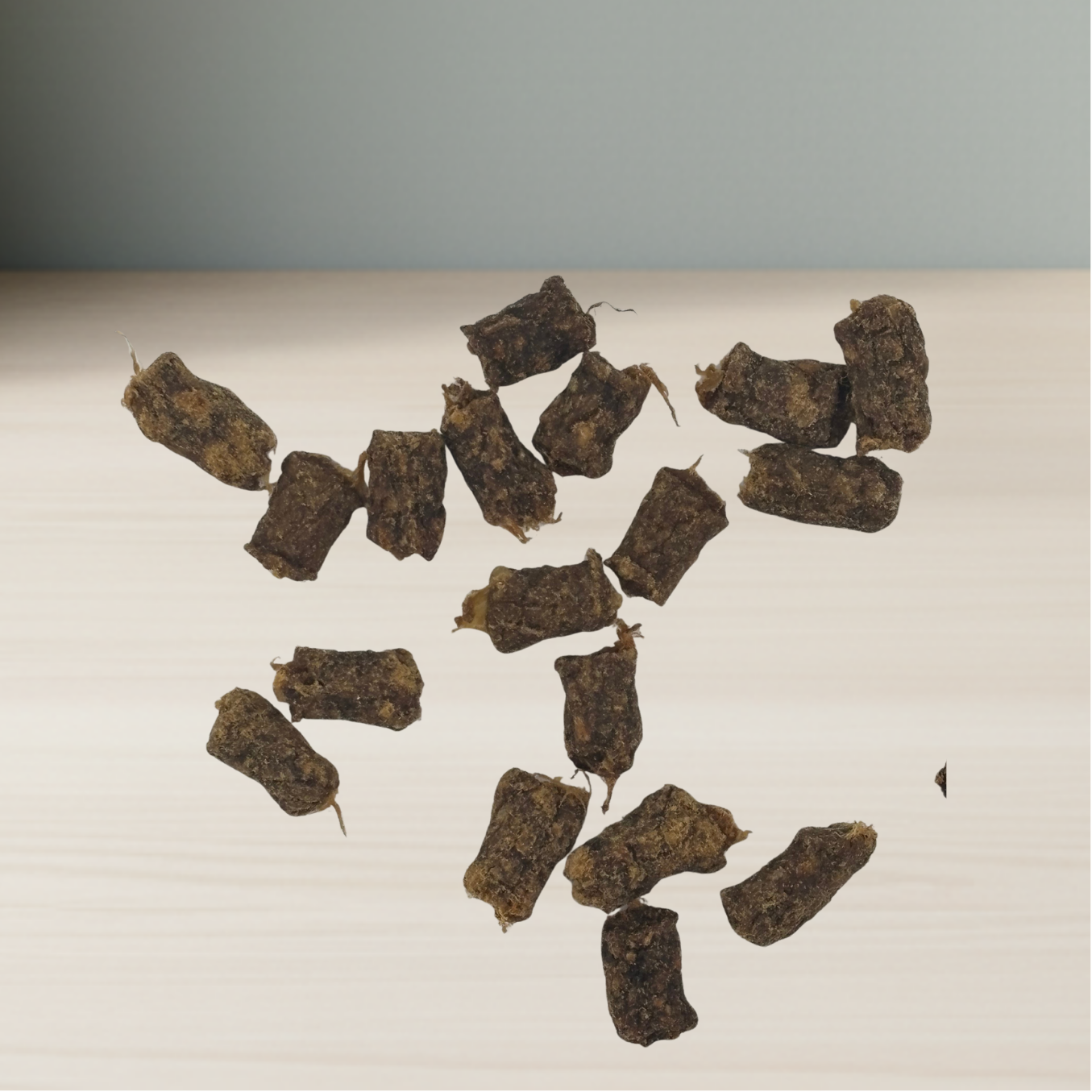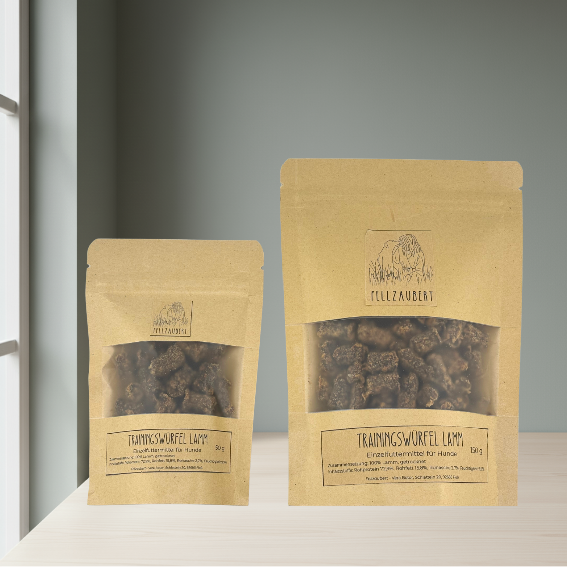Unsere Trainingswürfel Lamm bestehen zu 100 % aus schonend getrocknetem Lammfleisch – ganz ohne Zusätze, Getreide oder Gluten. Durch ihre handliche Größe von ca. 0,7 × 1,5 cm sind sie ideal für Training, Suchspiele oder einfach als kleine Belohnung zwischendurch.